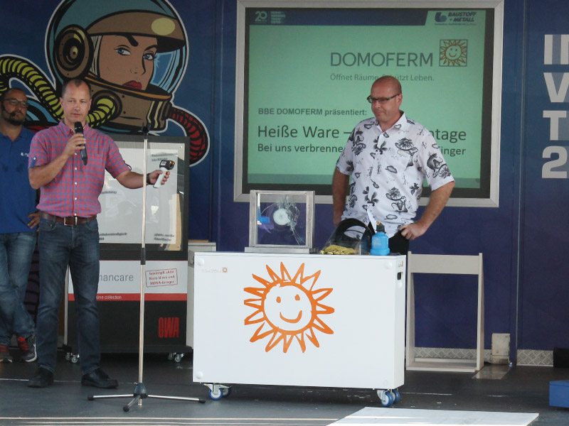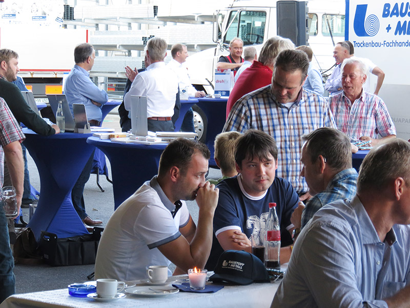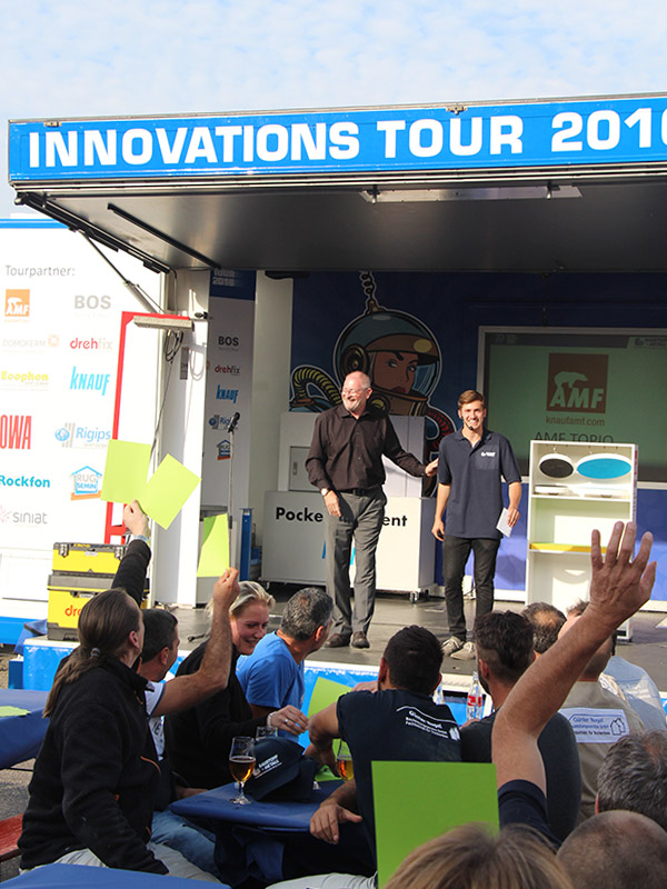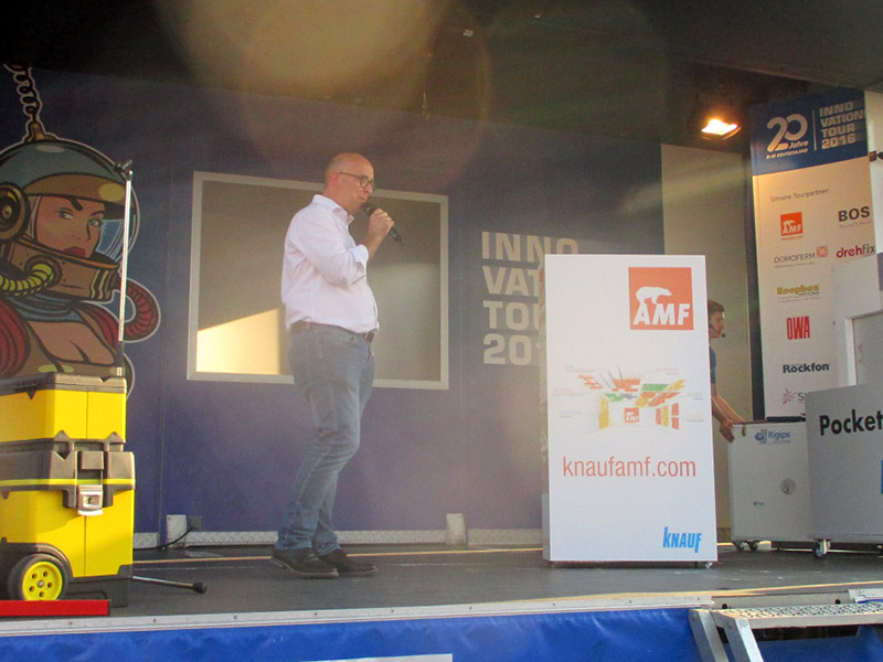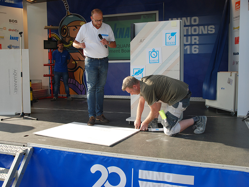 Bei jedem Tourstopp gab es ein Kräftemessen der besonderen Art. Bei einer „Speed Promotion“ hatten zwölf renommierte Hersteller – unter anderem Knauf, OWA und Rigips – drei bis fünf Minuten Zeit, ihre Produktinnovationen auf einer Bühne vorzustellen.